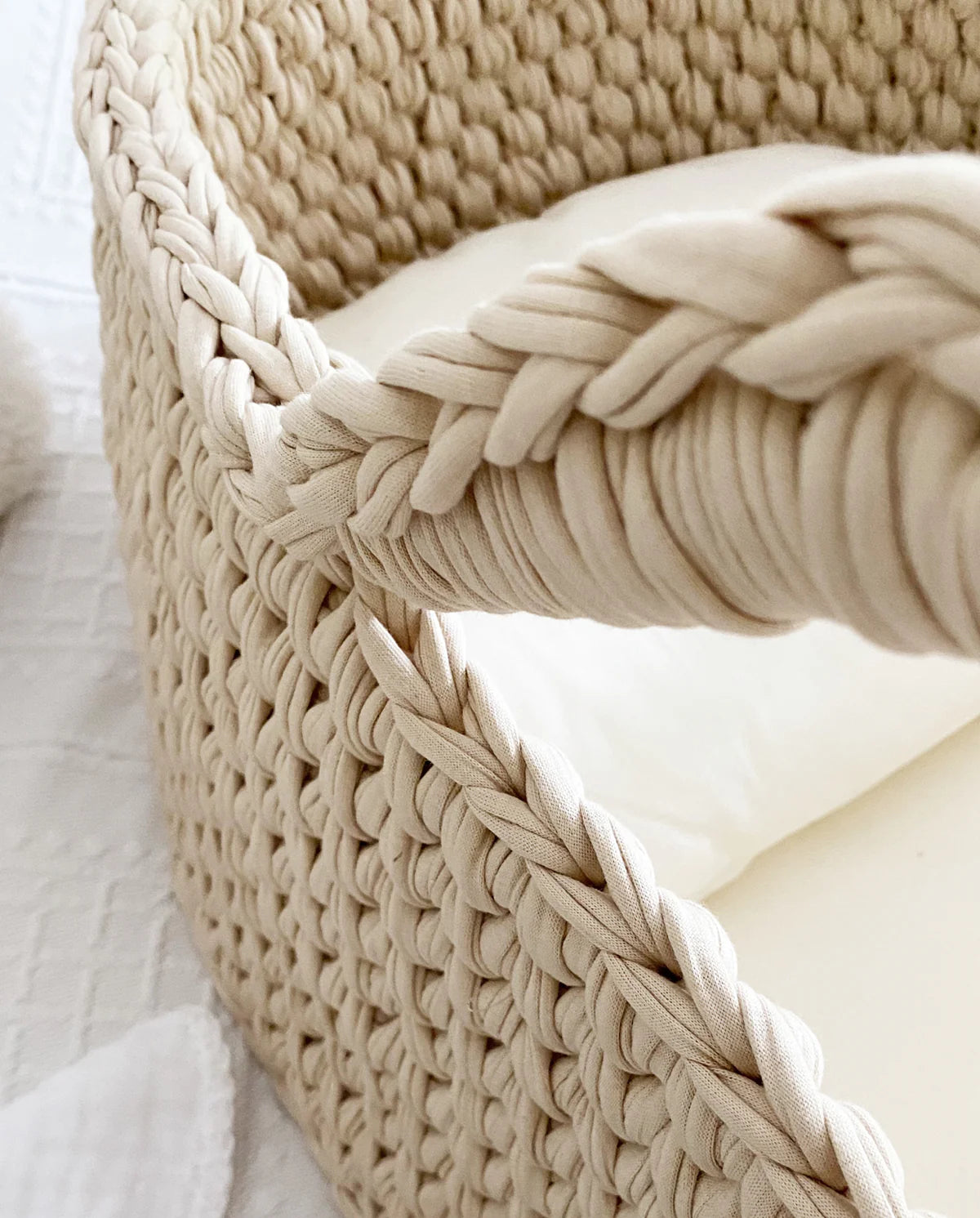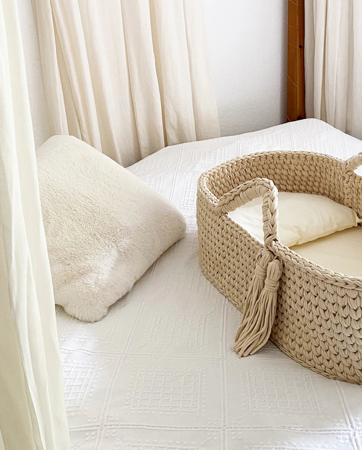 Dieser Babykorb bietet einen sicheren und gemütlichen Rückzugsort für Neugeborene, komplett handgefertigt mit Liebe und Sorgfalt. Mit seinen weichen Baumwollwänden, einer gepolsterten Matratze und einem kuscheligen Kopfkissen sorgt er für einen ruhigen und geborgenen Schlaf. Dank der praktischen Griffe ist der Korb flexibel und lässt sich leicht transportieren, sodass das Baby immer in der Nähe sein kann – ob zu Hause oder unterwegs.