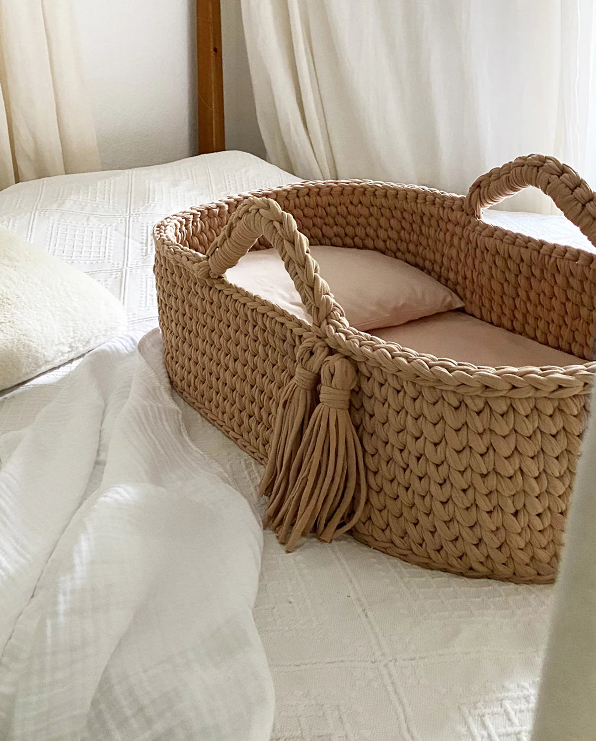 Zum Lieferumfang gehören der Korb, die Matratze und das Kopfkissen. Zusätzliches Zubehör wie Bettwäsche, Kissenrollen, ein Wiegengestell oder ein passender Spielbogen sind separat erhältlich.
