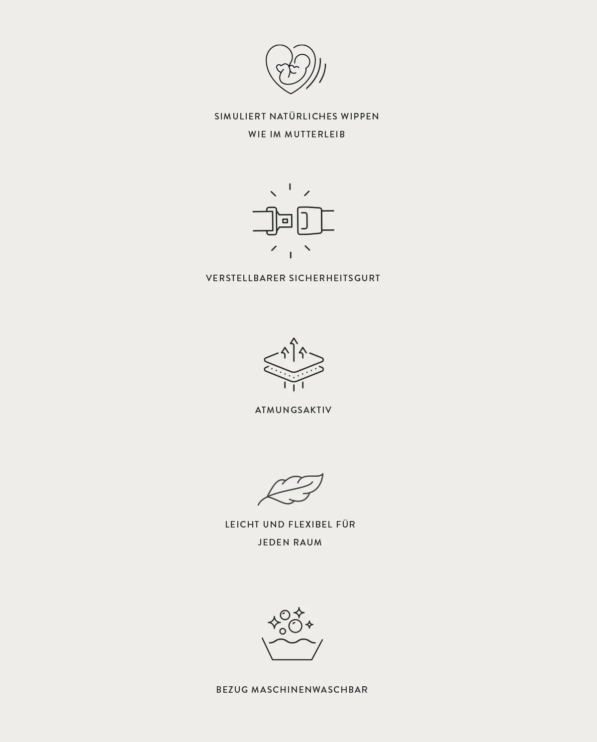 - Beruhigung durch sanftes Wippen: Das sanfte Schaukeln simuliert die vertrauten Bewegungen des Mutterleibs, hilft bei unruhigen Phasen und unterstützt beim Einschlafen.
