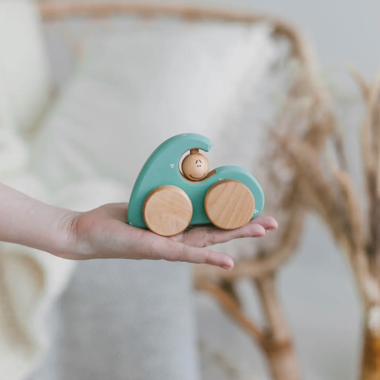 Verwendete Materialien: nachhaltig geerntetes Birkenholz, mit natürlicher Milchfarbe bemalt und mit Leinöl veredelt.