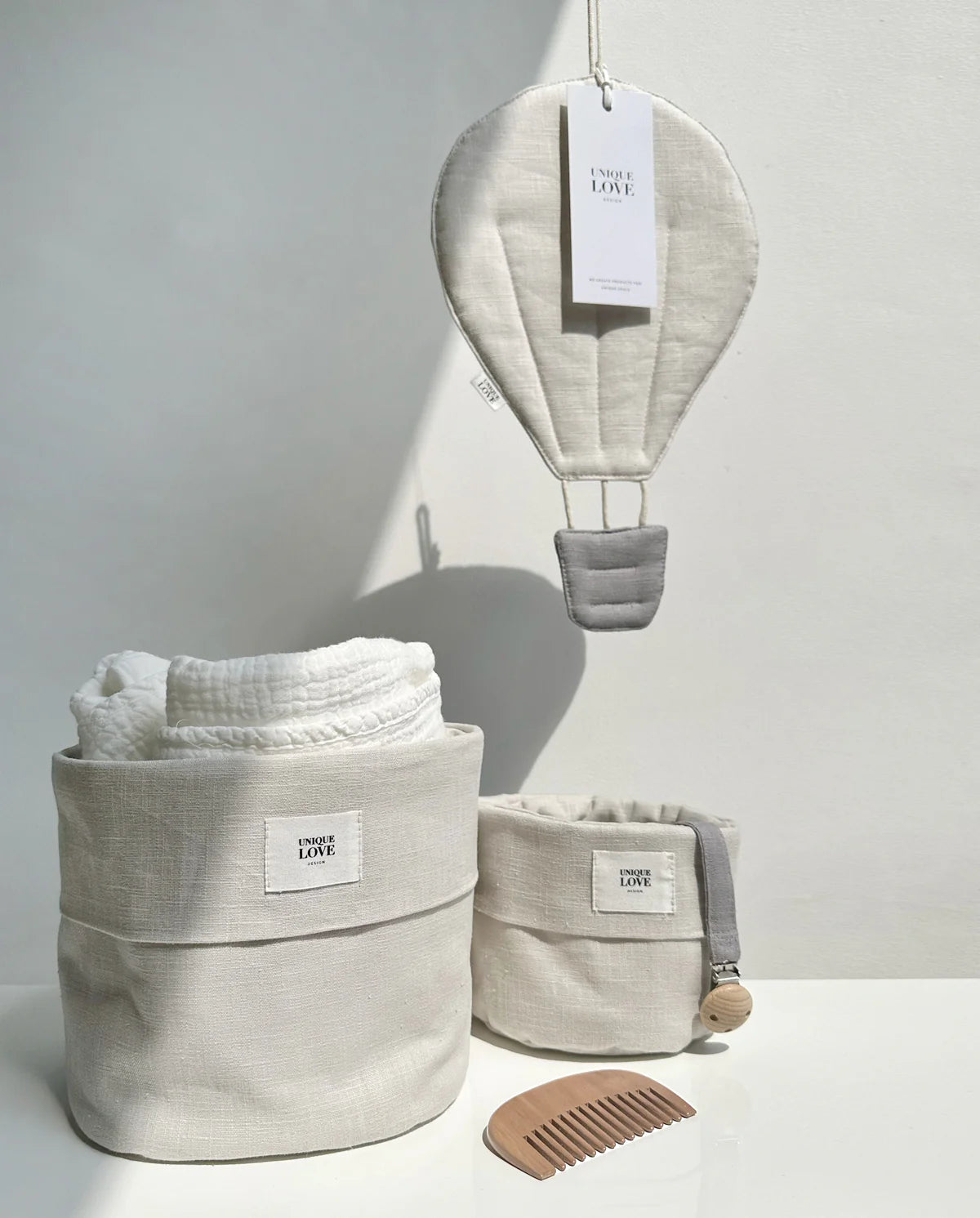 Entdeckt unseren bezaubernden Fly to the Sky - Heißluftballon. Handgefertigt in einem Hamburger Atelier aus feinem Leinenstoff. Unsere Kleinsten werden staunend das Schaukeln des Ballons beobachten.
