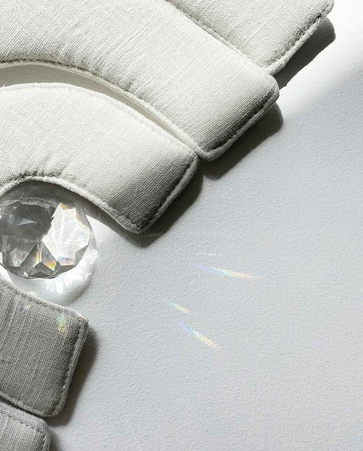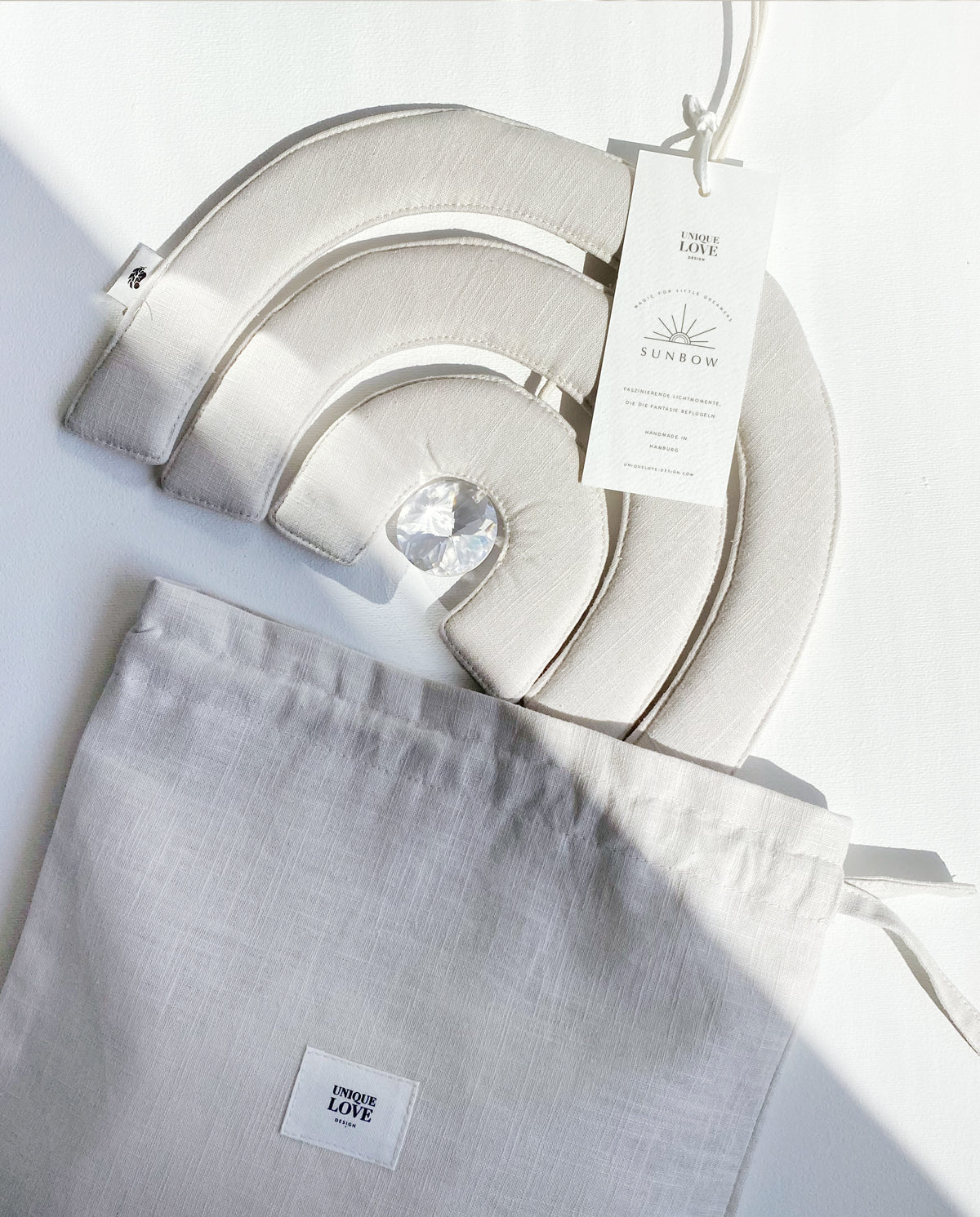 Entdeckt unseren bezaubernden SUNBOW Sonnenfänger. Handgefertigt in einem Hamburger Atelier aus feinem Leinenstoff und einem hochwertigen Glaskristall (Prisma). Dieses einzigartige Accessoire verwandelt Sonnenlicht in funkelnde Lichtreflexe, die vom Kristallprisma über Wände und Decken tanzen.