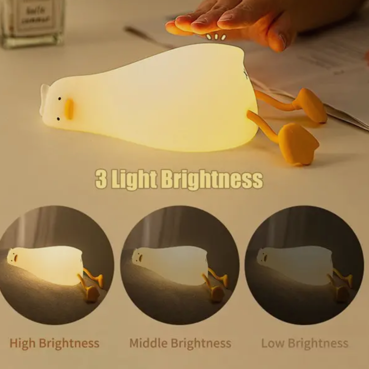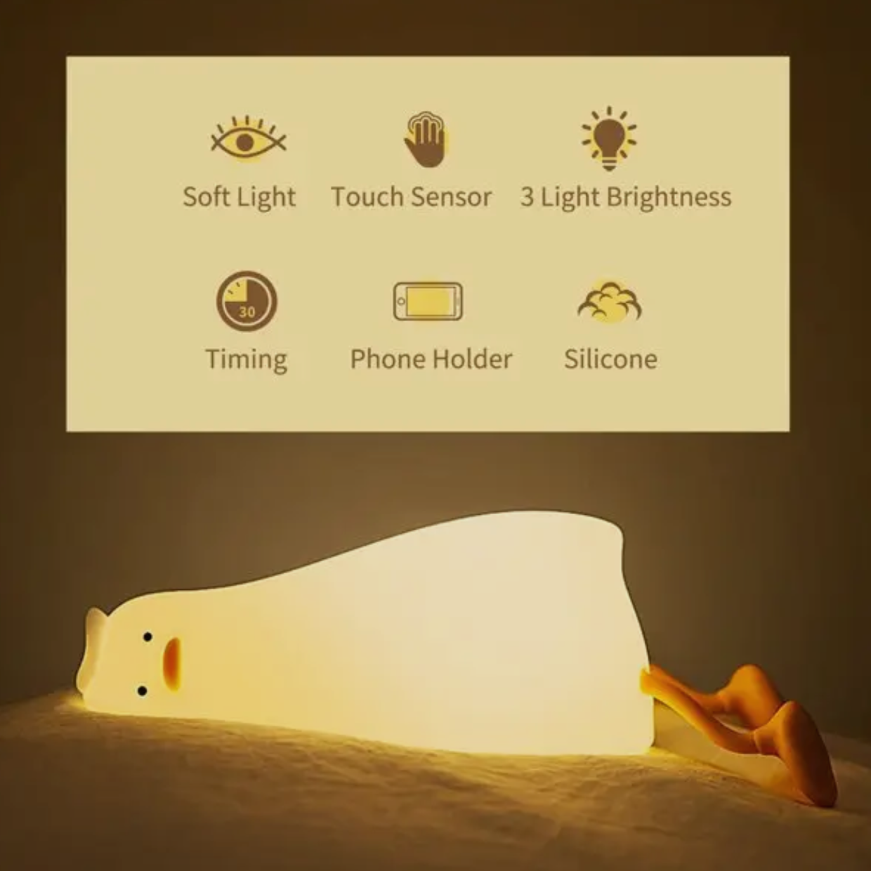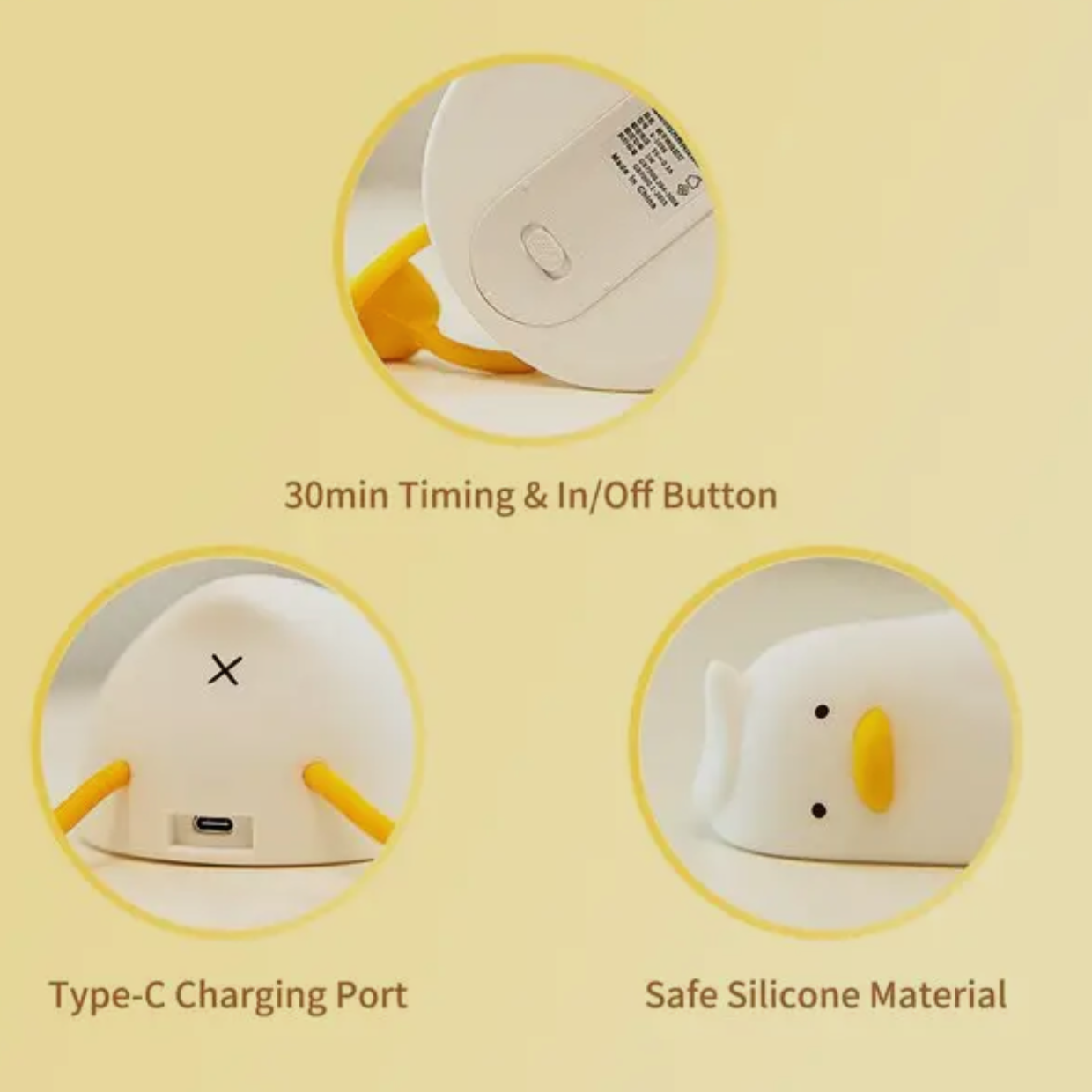 Licht hat die Form einer Ente und kann in drei verschiedenen Positionen erscheinen: Weich, etwas heller und hell. Sie können auch einen 30-Minuten-Timer einstellen, sodass sich das Licht automatisch ausschaltet, wenn Ihr Kind eingeschlafen ist. Das Licht ist über ein USB-