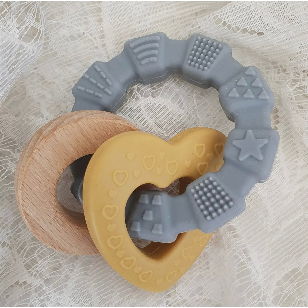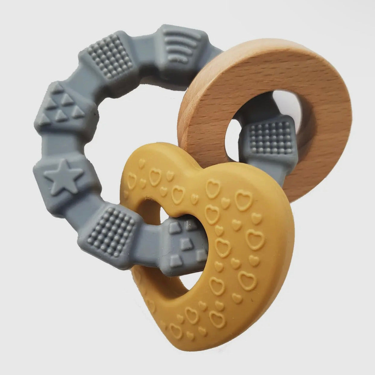 Beißring aus Silikon und Holz, der für das Baby leicht zu greifen, zu schütteln und zu kauen ist.